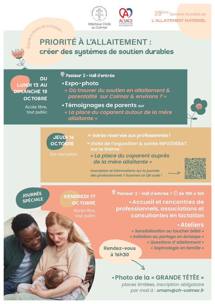 Nous animerons également une soirée réservée aux professionnels le jeudi 16/10 à partir de 19h : conférence-débat ouverte aux professionnels de santé et associations sur le thème « La place du coparent auprès de la mère allaitante » (uniquement sur inscription : smam@ch-colmar.fr).