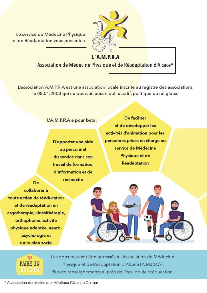 L’association AMPRA a pour mission de faciliter et développer les activités d’animation pour les patients pris en charge en Médecine Physique et Réadaptation, ainsi que d’accompagner l’équipe dans ses actions de formation, d’information et de recherche.